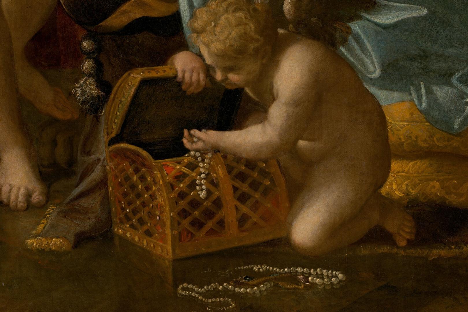 In the left half of this horizontal painting, a bare-chested, seated woman, Venus, is tended by three nude women and several child-like, nude, winged putti. All the women and putti have pale, peachy skin. To our right, a statue of a man stands on an ornately carved pedestal on a veranda in front of a distant landscape. Venus sits facing our right and she looks into a rectangular, black-framed mirror she holds up with her left hand. Her blond hair is braided and she has delicate features. A sky-blue cloth wraps around her waist and lap, and covers her legs. One foot rests on the lap of a seated putto, who ties on a sandal. Another putto helps hold up the mirror. A third putto near us, in front of Venus, pulls strings of pearls from a gold box and the fourth, in the lower left corner, lifts a comb and long needle out of a gilded, rectangular box. Two of the women behind Venus tend to her hair and the third holds up and gazes at a teardrop-shaped pearl. A dusky rose-pink curtain falls behind the women and putti. The view opens onto a terrace on the right half of the painting. A gray stone sculpture of a nude man holding up a bunch of grapes with one hand and bracing a tall stick with the other stands facing our left on an ornately carved base. The base is made up of a wide, shallow bowl above a single pedestal foot. In the distance, two people sit against a tall balustrade. The person on the left wears gold-colored armor, a helmet, and holds a long spear. The bearded man to the right appears to be nude as he leans to the side toward his companion, resting his hand and chin along a staff propped on the bench’s seat. Trees and mountains in the landscape beyond are painted with brown, deep gray, and forest and sage green. A sliver of white sky along the horizon brightens an otherwise steel-gray sky. (NGA)