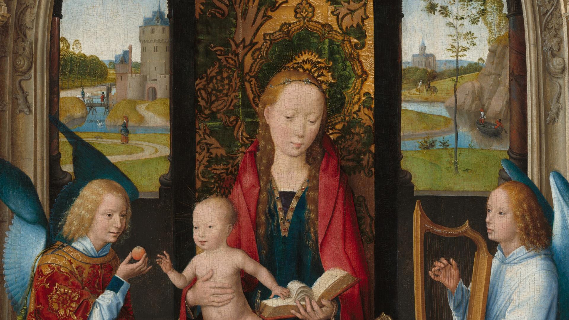 Shown under an ornately carved stone arch, a young woman holds a baby on her lap as she sits on a curving gold chair flanked by two kneeling angels in this vertical painting. All of the people have pale skin. The woman has long blond hair, a straight nose, and a small pink mouth. Her body faces us but she gazes down. She wears a gold-trimmed, deep blue robe under a crimson-red mantle that covers her shoulders and drapes over her lap and to the floor. She holds an open book with her left hand, on our right, and supports the sitting baby’s body with her other hand. The baby is nude except for a piece of white fabric across one thigh. The baby touches the open book with one hand and reaches toward a small, round piece of fruit the angel on our left offers. That angel has blond hair and sapphire-blue wings, and wears a pale blue garment under a red and gold patterned robe. The angel holds out the fruit with the right hand and in the other, holds an instrument like a violin and bow. The angel to our right has similar hair and facial features, and has blue wings and a sky-blue robe. Both hands strum a harp as the angel gazes to our left almost in profile. Behind the chair, a cloth patterned in pine green and gold hangs vertically from a curving red overhang between tall, narrow archways that open onto a landscape. In the distance, people move through green fields and along a river winding toward a castle to our left beneath a clear blue sky. The angels’ wings overlap with the stone archway that frames the scene. It is carved along the inner edge of the arch with vines, lizards, and snails. Two columns flank the arch and atop each is a bearded man, as if carved from the same cream-colored stone of the arch. The man to our left holds a harp and the one to our right holds a saw. Winged, nude, child-like people, putti, hold orbs aloft in the upper corners. (NGA)