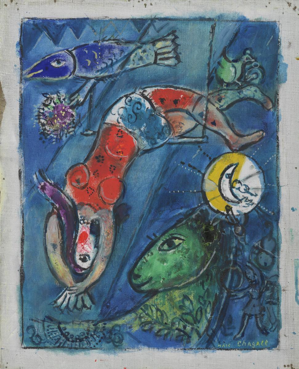 Chagall drew inspiration from the theme of the circus throughout his life. As a child in Russia, he had been fascinated by the travelling acrobats he saw at village fairs. After he moved to Paris, Ambroise Vollard regularly accompanied him to the circus, where he would sit in the audience and sketch. The chaotic and colourful atmosphere of the circus captivated Chagall. Here, he saw all aspects of life represented, from the comic to the tragic. He later said, ‘For me a circus is a magic show that appears and disappears like a world.’ Circus performers, with their outlandish costumes and garish make-up, were ideal characters to populate Chagall‘s dream-like compostions. (Tate)