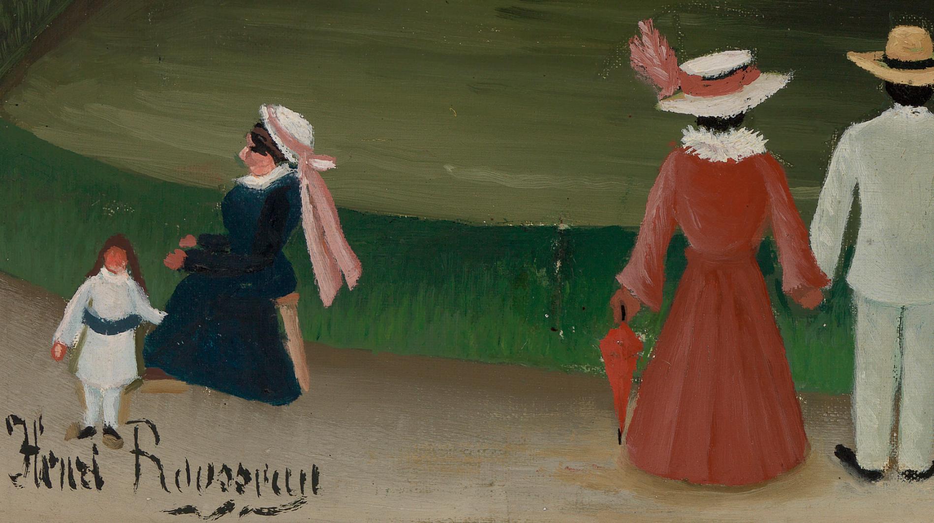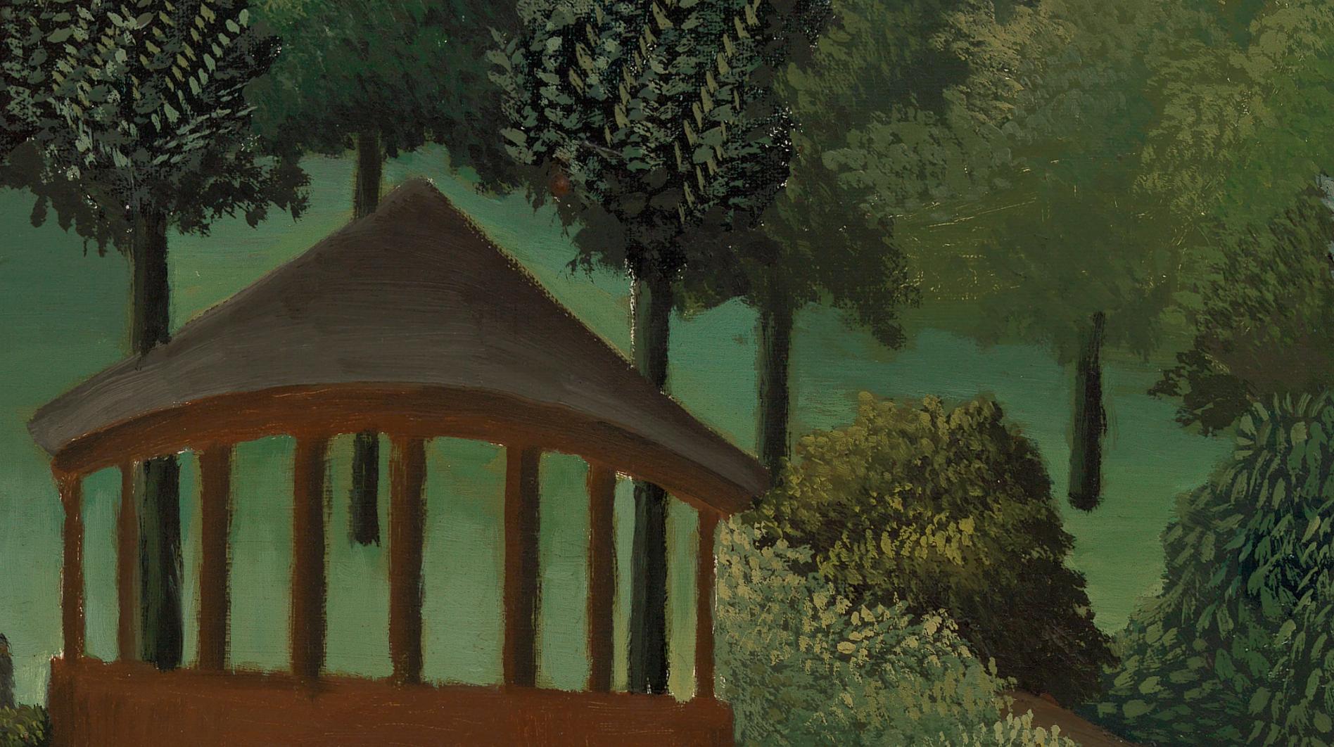 Here we see a group of people strolling through the Parc Montsouris, one of four parks that opened in Paris during the 1870s, a period of urban renewal throughout the city. A popular location, the park included an artificial lake, which Rousseau has pictured here. The flatness of the scene makes it look as though the figures in the foreground are walking across a stage and the landscape is painted on a backdrop. Many artists in later generations admired this sense of spatial dislocation, often present in Rousseau‘s works. (Barnes)