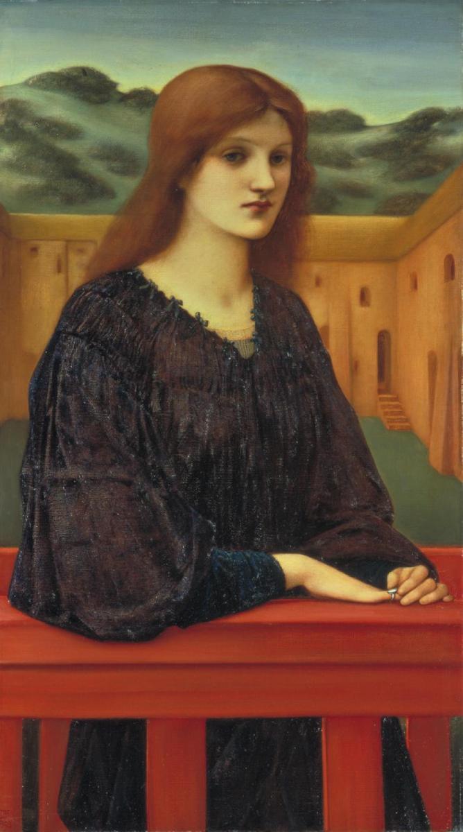 This picture evokes a mood of contemplation and stillness. Its Latin title means ‘Evening Quiet’. Burne-Jones is believed to have employed a model named Elizabeth Keene, who he invited to watch him work on the painting. She is seen in a three-quarter view leaning on a balustrade in a pose reminiscent of Italian Renaissance portraits. These had greatly impressed Burne-Jones on his second visit to Italy with John Ruskin, in 1862. (Tate)