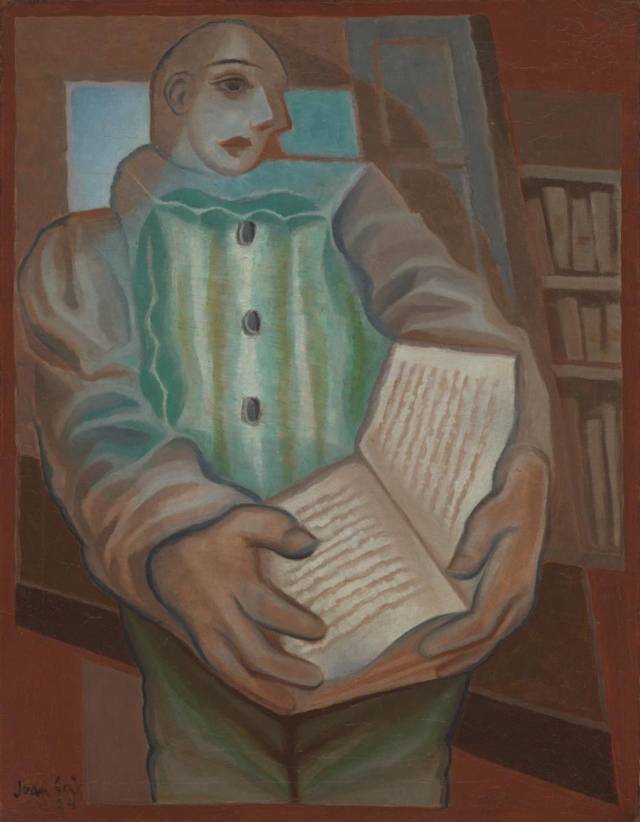 Although this painting is resolutely figurative, it is strongly influenced by Cubism. Pierrot’s upper body is neatly framed within the architectural framework of the window behind him and the depiction of his face combines a frontal and sideways perspective. The greatly exaggerated hands contrast with the impression of daintiness given by Pierrot’s cupid-bow mouth and the soft pastel hues employed by Gris. (Tate)