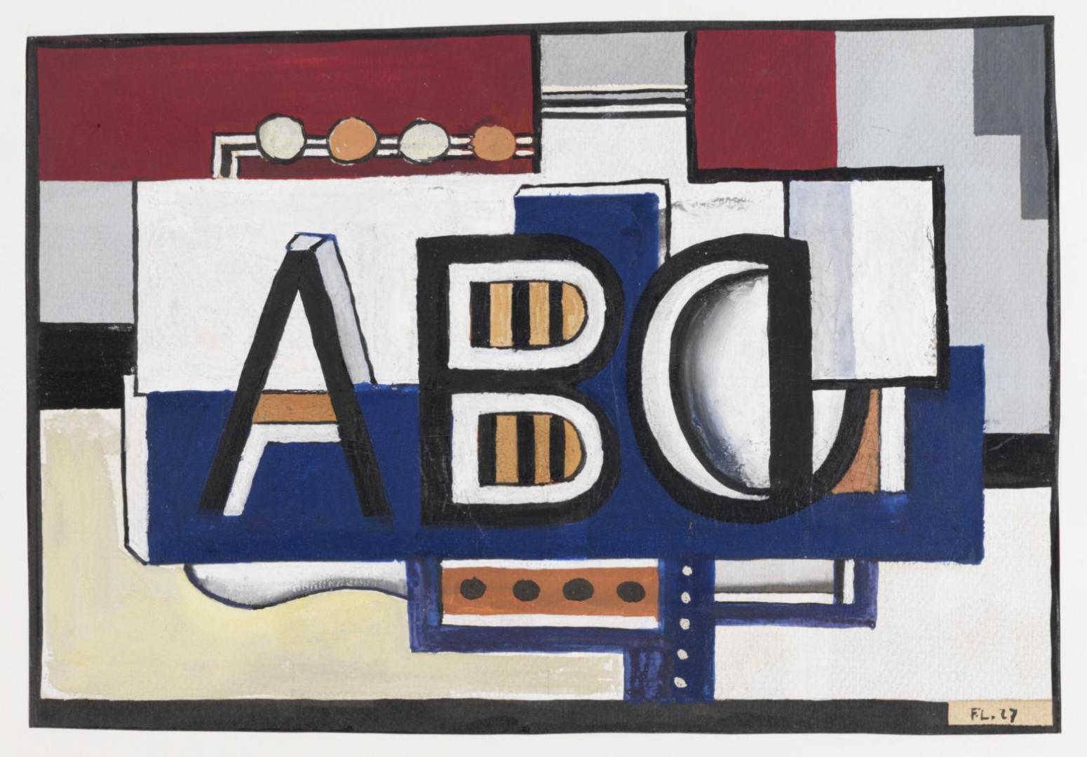 ABC is a preparatory study in gouache for the oil painting Nature morte A.B.C., 1927, given by Léger’s art dealer Daniel-Henry Kahnweiler to the Musée Fernand Léger in Biot. It is an abstract still life that features lettering, in a style reminiscent of early Cubism, and combines it with abstract elements on a tilted plane.