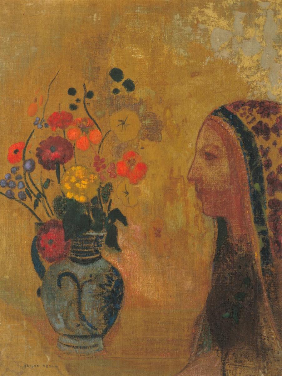 This medium-size oil painting by the French artist Odilon Redon depicts a vase of flowers on the left side of the composition and a woman’s head and shoulders shown in profile on the right, facing the vase. The woman wears a patterned headscarf, and the back of her head and the lower part of her body are cropped out of the scene at the edges of the canvas. The vase and the woman are shown quite close up and therefore seem to occupy the foreground of the scene, but the pictorial space in this painting remains ambiguous due to the fact that it has no discernible setting – only a flat, mottled yellow-ochre background. Although the artist has used strong tones of red, blue, orange, purple and dark green paint to depict the woman and the vase of flowers, the ochre background shows through this paint in several areas, which has the effect of placing all of the elements of the scene onto a single flat plane. Redon’s name is inscribed onto the painting at the bottom left corner of the painting.