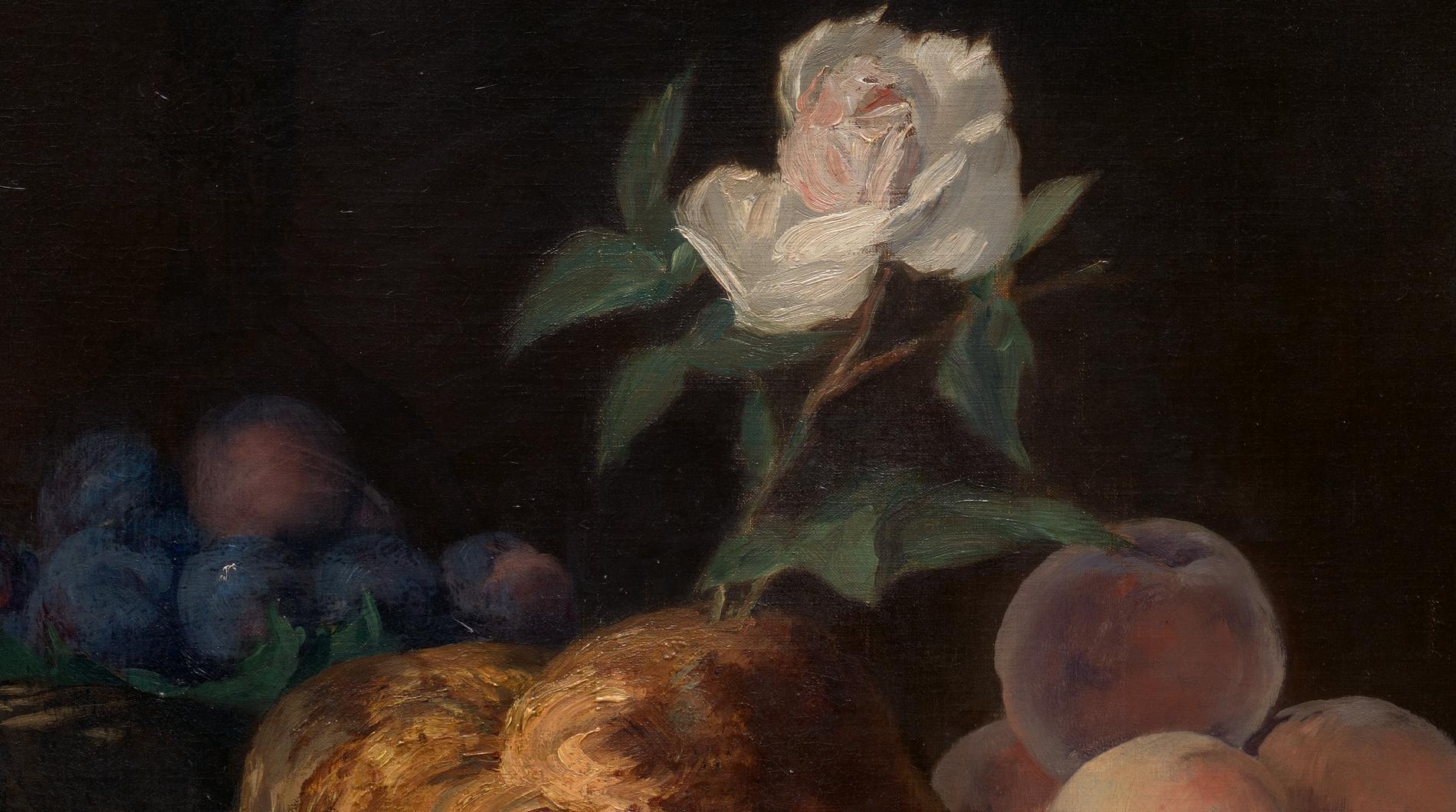 Manet reportedly called still life the “touchstone of the painter.” From 1862 to 1870 he executed several large-scale tabletop scenes of fish and fruit, of which this is the last and most elaborate. It was inspired by the donation to the Louvre of a painting of a brioche by Jean Siméon Chardin, the eighteenth-century French master of still life. Like Chardin, Manet surrounded the buttery bread with things to stimulate the senses—a brilliant white napkin, soft peaches, glistening plums, a polished knife, a bright red box—and, in traditional fashion, topped the brioche with a fragrant flower. (MET)