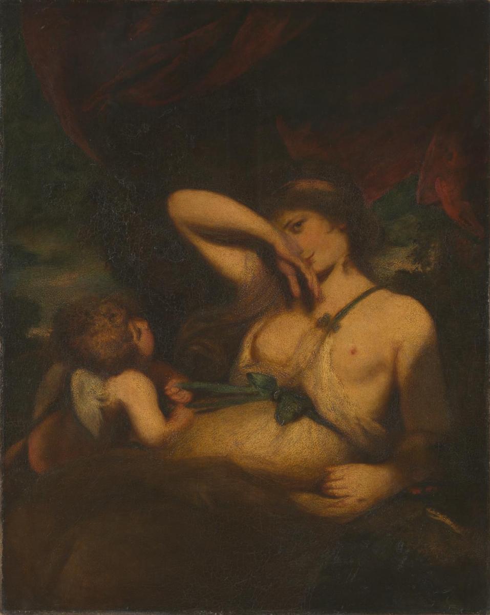 This is an autograph version of Reynolds‘s famous picture of 1784, painted for Lord Carysfort (now Tate Gallery, London). Carysfort, who visited Russia on a number of occasions, asked the artist to make the copy as a gift for Prince Grigory Potyomkin. In this work of charming but sensuous intimacy – Reynolds originally suggested it should be called “Half Consenting” – the goddess of beauty and love, Venus, is a coquettish young woman, hiding her face from immodest glances with her arm. Mischievous Cupid is pulling at the end of the blue silk ribbon which encircles her waist, looking attentively up at his mother to watch her reaction. It is possible that the model for the original painting was Emma, Lady Hamilton, famous as the mistress of Lord Nelson. (SHM)