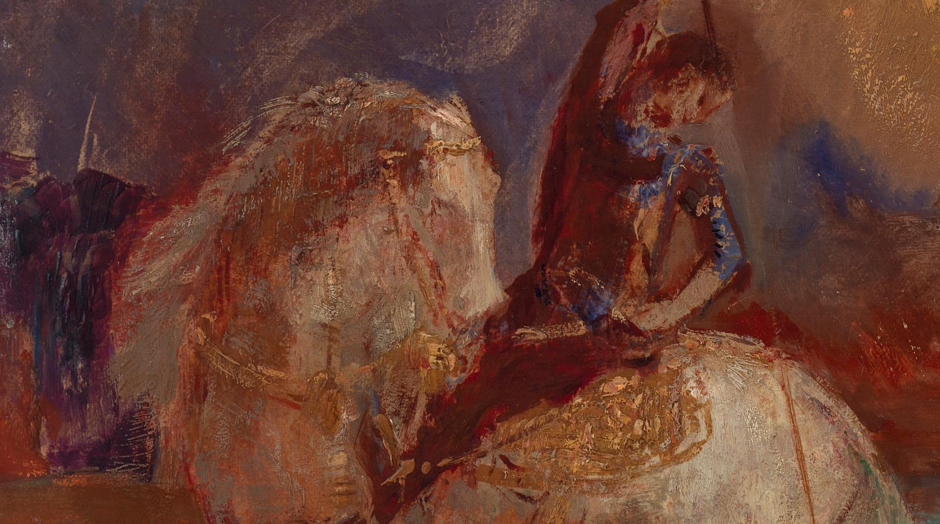 According to Christian legend, Saint George, a Roman soldier, heroically killed a dragon that was terrorizing a Libyan city, causing the grateful citizens to convert to Christianity. In this painting, Odilon Redon presents the climactic moment of the slaying but makes the gore and the action rather difficult to see, pushing it off to the side. Instead, he relies on the fiery colors of the landscape to create drama. (Barnes)