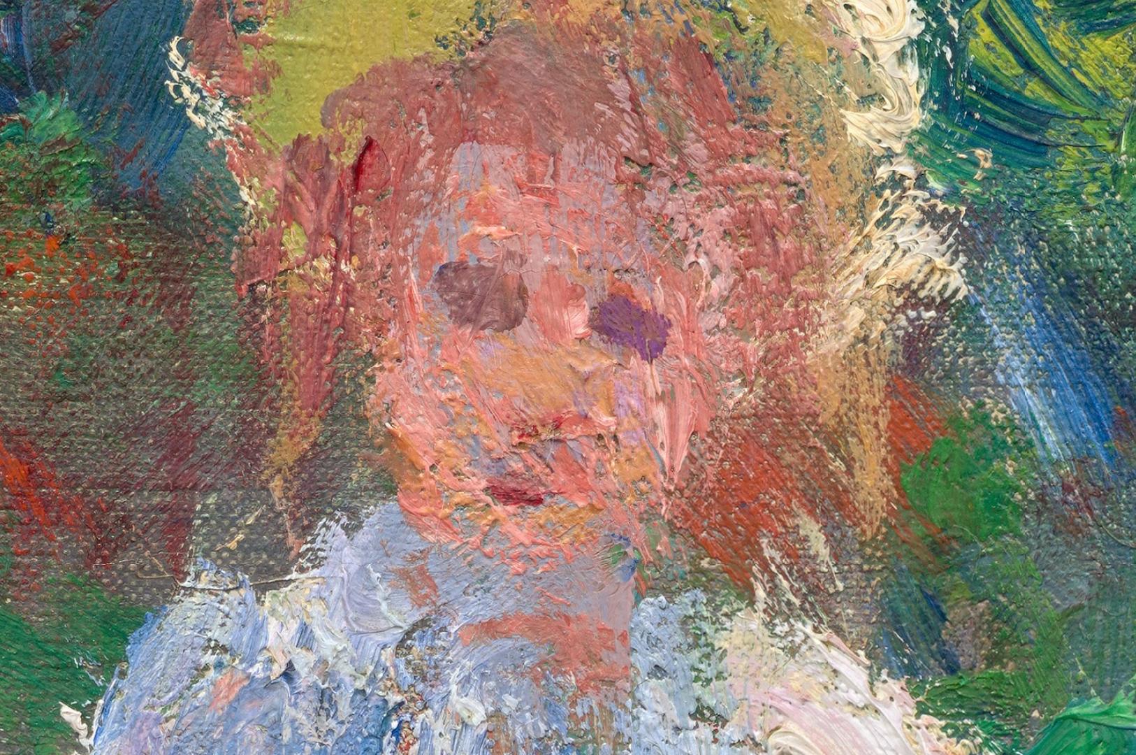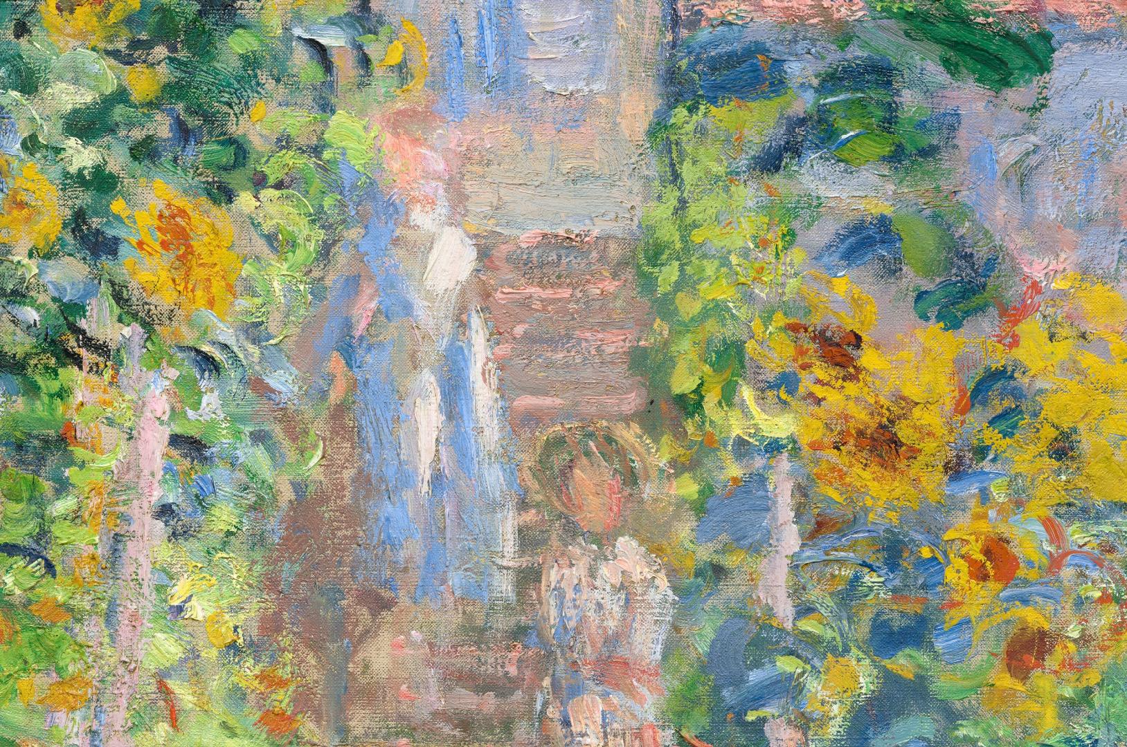 A small child stands facing us on a sun-dappled path that runs up the center of a garden dominated by towering yellow and burnt-orange sunflowers in this loosely painted, vertical scene. The light comes from our right so long, sea-green and plum-purple shadows cross the peach-colored path. The path is wide at the bottom center of the canvas and narrows as it reaches the steps of a house, beyond the garden. Close to us, four blue and white porcelain urns line the path, separating it from the grassy banks to either side. The urns are filled with tall stems with coral-pink and cardinal-red flowers. The child stands about halfway back along the path, where the garden transitions from grass to the banks of tall sunflowers. A few strokes in front of the child could be a small dog. Behind the child, a woman and another child stand on the steps. The woman wears a cornflower-blue and white dress, while both children have bare legs and wear white clothes and yellow hats. All three have indistinct facial features and peach-colored skin. The house spans with width of the composition. It has an amethyst-purple roofline with two chimneys, and the petal-pink walls have mango-yellow highlights. Windows are covered with blue latticework. Above the house, fluffy white clouds float against a vibrant blue sky. The artist signed and dated the painting at the lower right in dark blue, “Claude Monet 80.”