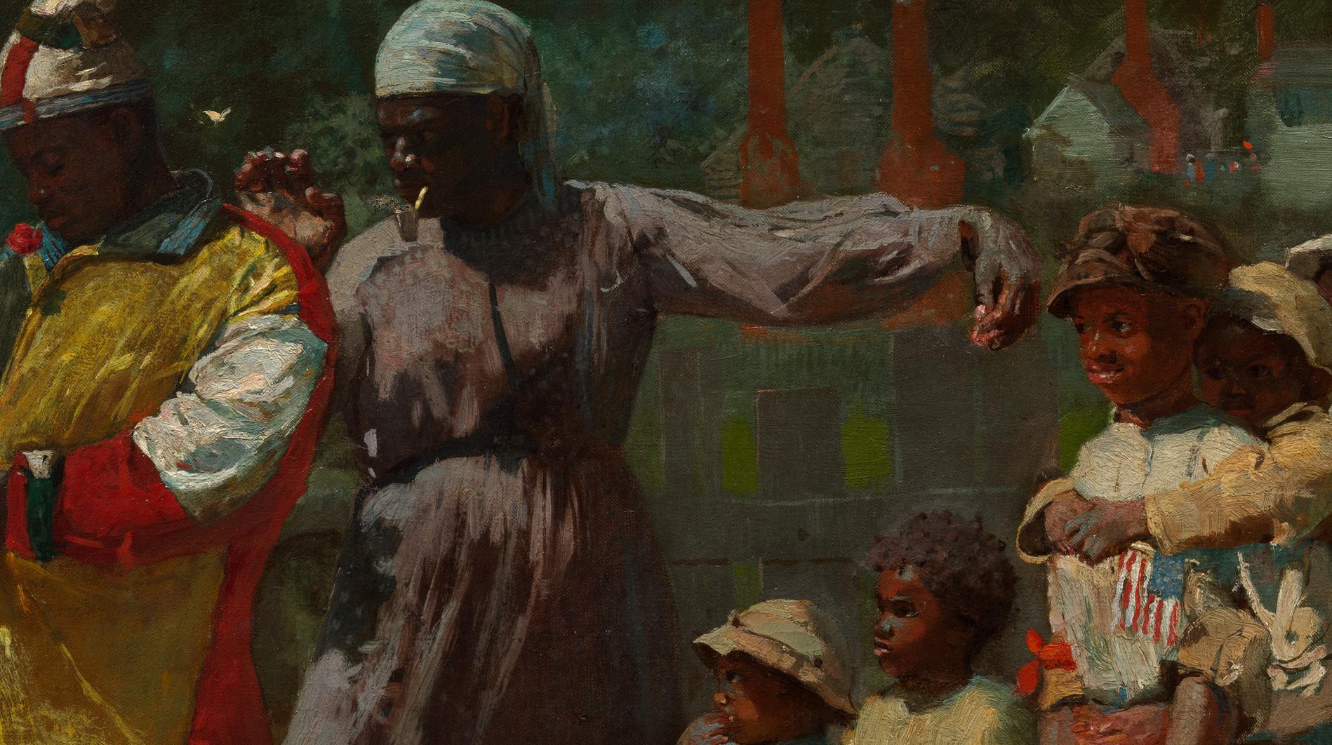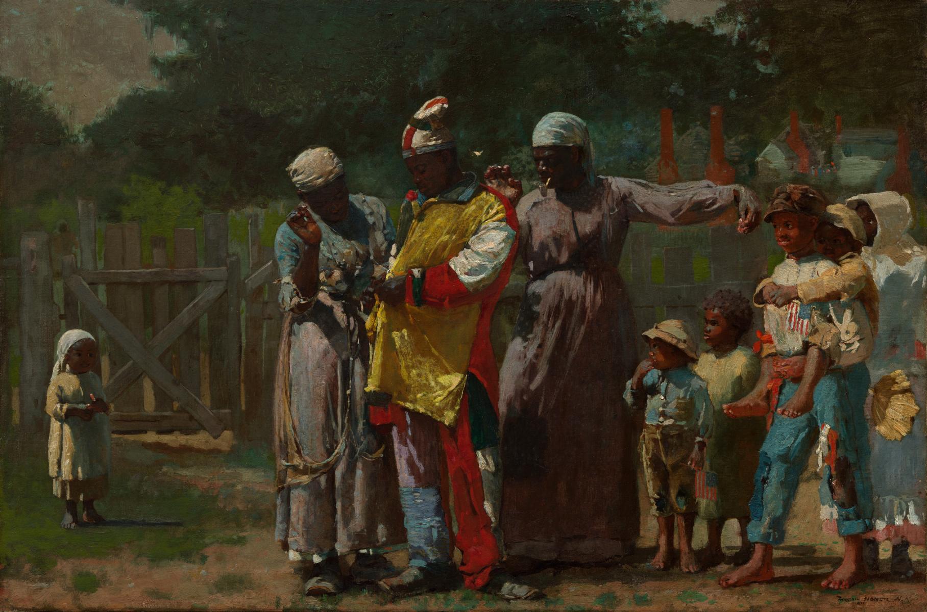 In this painting Homer evoked the dislocation and endurance of African American culture that is a legacy of slavery—specifically the Jonkonnu festival, rooted in the culture of the British West Indies and celebrated by enslaved people in Virginia and North Carolina. After the Civil War, aspects were incorporated into Independence Day events. The painting’s original title was Sketch—4th of July in Virginia. The theme of freedom was particularly relevant in 1877, when Black Americans saw an end to their brief experience of full civil rights after federal troops withdrew completely from the South. (MET)
