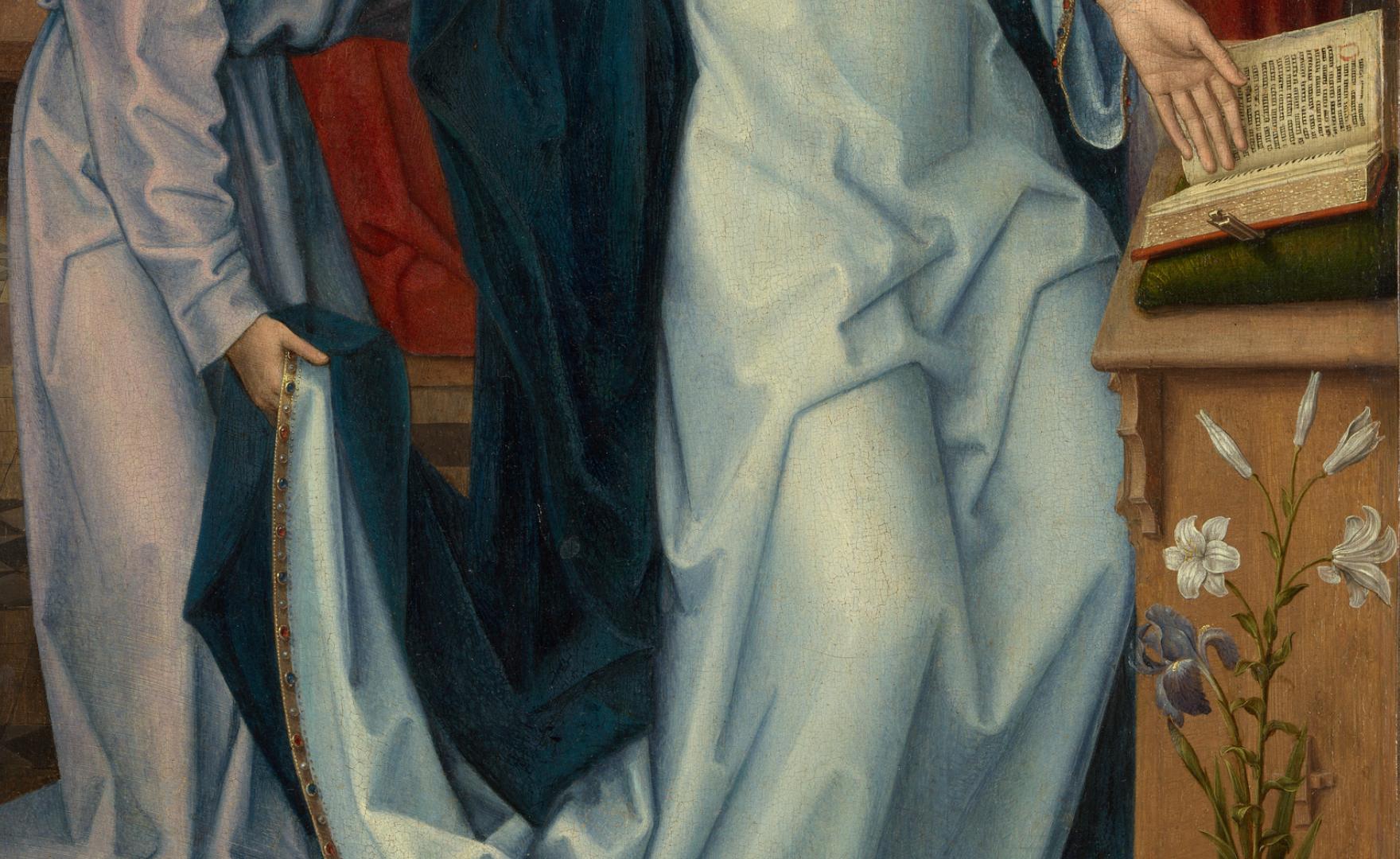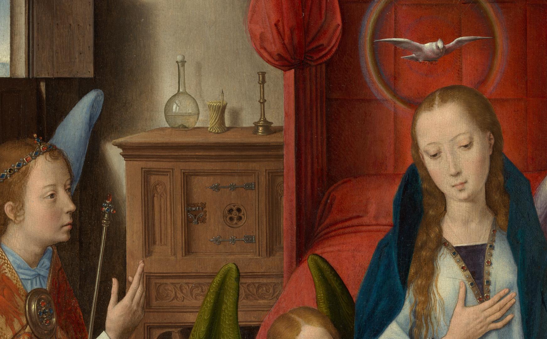 Memling modeled this Annunciation on the left wing of Rogier van der Weyden’s Saint Columba Altarpiece (now in Munich), but his innovative rendition portrays the Virgin swooning and supported by two angels, rather than kneeling. Like other fifteenth-century Flemish painters working in the wake of Jan van Eyck, Hans Memling cloaked religious imagery in the pictorial language of everyday life, paying close attention to naturalistic detail. This Annunciation takes place in a comfortably appointed bedchamber, though many of the domestic furnishings have symbolic connotations. The carafe of water, through which light passes uncorrupted, and the vase of lilies are symbols of the Virgin’s purity, while the empty candleholder signifies her imminent role as bearer of Christ, light of the world. Gabriel’s priestly garb alludes to the ritual of the Mass and, therefore, the incarnation of Christ. A soft glowing light falls on the Virgin and suffuses the room, elevating the scene from the realm of the ordinary and signaling the sacred nature of the drama. (MET)