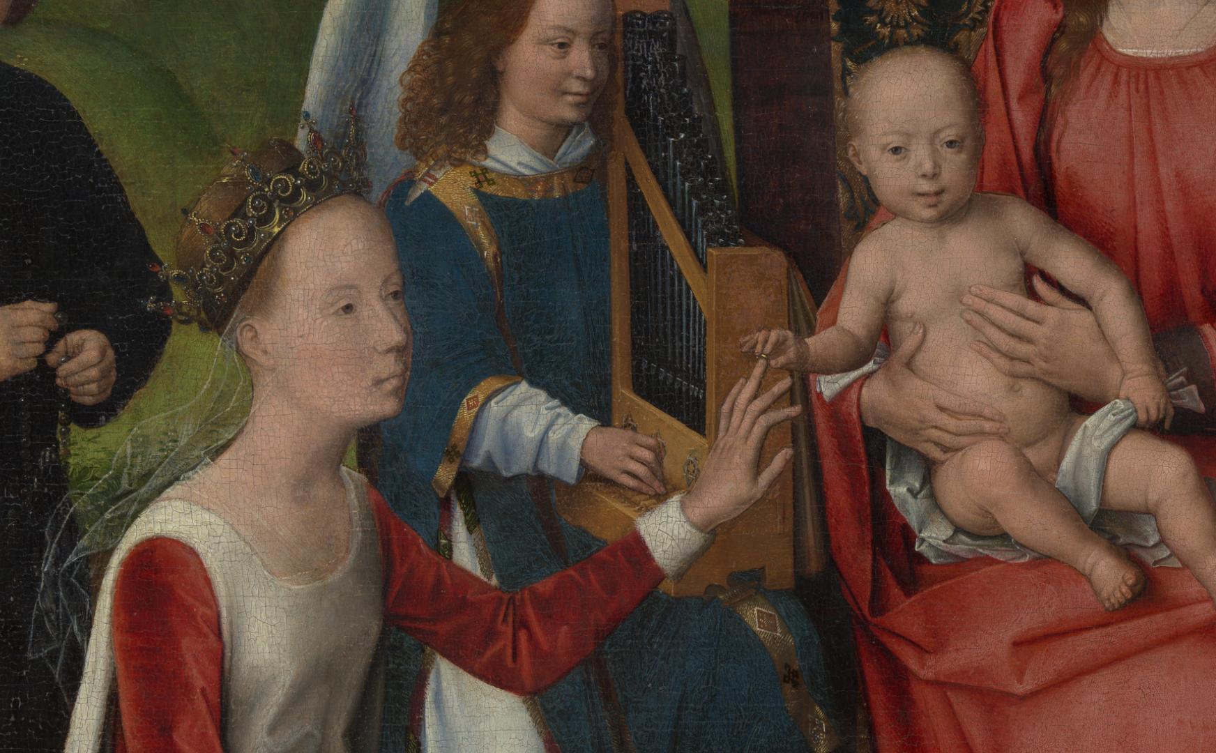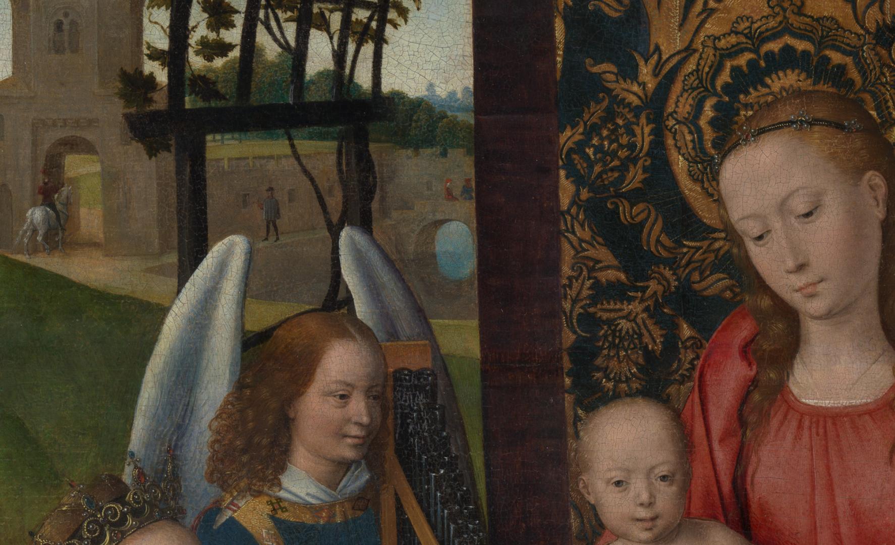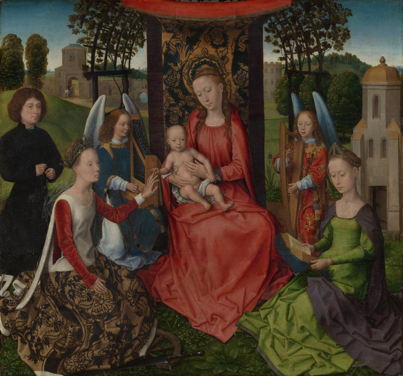 Memling adapted this composition from a large, celebrated altarpiece that he completed in 1479 for the Sint-Janshospitaal in Bruges. This smaller, more modest version was commissioned by an unidentified donor who kneels at the left. He is shown reciting his rosary as he contemplates Saint Catherine’s mystic marriage to the infant Jesus. Saint Barbara, whose attribute—the tower—is behind her, sets a meditative example by reading. The grape arbor above the Virgin’s throne was most likely added shortly after Memling’s lifetime, in the early sixteenth century, when the cult of the Eucharist became increasingly popular. (MET)