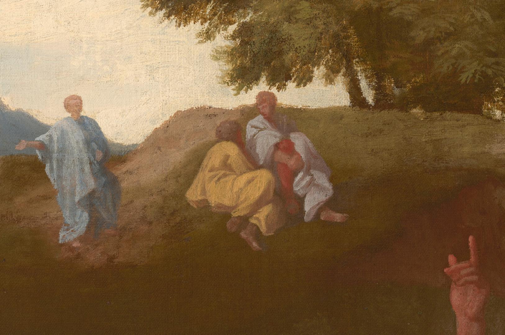 Although Nicolas Poussin‘s work exerted an enormous influence on the development of French seventeenth-century painting, the artist perfected his style in Rome, incorporating the lessons of Renaissance and contemporary Italian painters into his own idiom. Poussin‘s Baptism of Christ is one of a series of canvases illustrating the Seven Sacraments executed from 1638–1642 for his friend and patron Cassiano dal Pozzo. In Poussin‘s composition, the river Jordan winds through the foreground plane where he has placed thirteen figures. Christ is located to the right of the canvas; on his left side — which represents paradise — two figures, probably wingless angels, kneel to help him. To his right, on the earthly side of the Jordan, Saint John holds a vessel over Christ’s head. The reactions of the figures to the right of Christ demonstrate why mastery of the human form was essential to history painting. The row of figures behind Saint John have anguished expressions and contorted poses. Poussin has depicted the specific moment when the voice of the Lord proclaimed: “This is my beloved son, in whom I am well pleased” (Matthew 3:17). By presenting complex poses and physiognomies, Poussin has evoked a very human reaction — the fear of those present as they acknowledge Christ as the son of God — thereby encouraging the viewer to identify with this significant moment. (NGA)