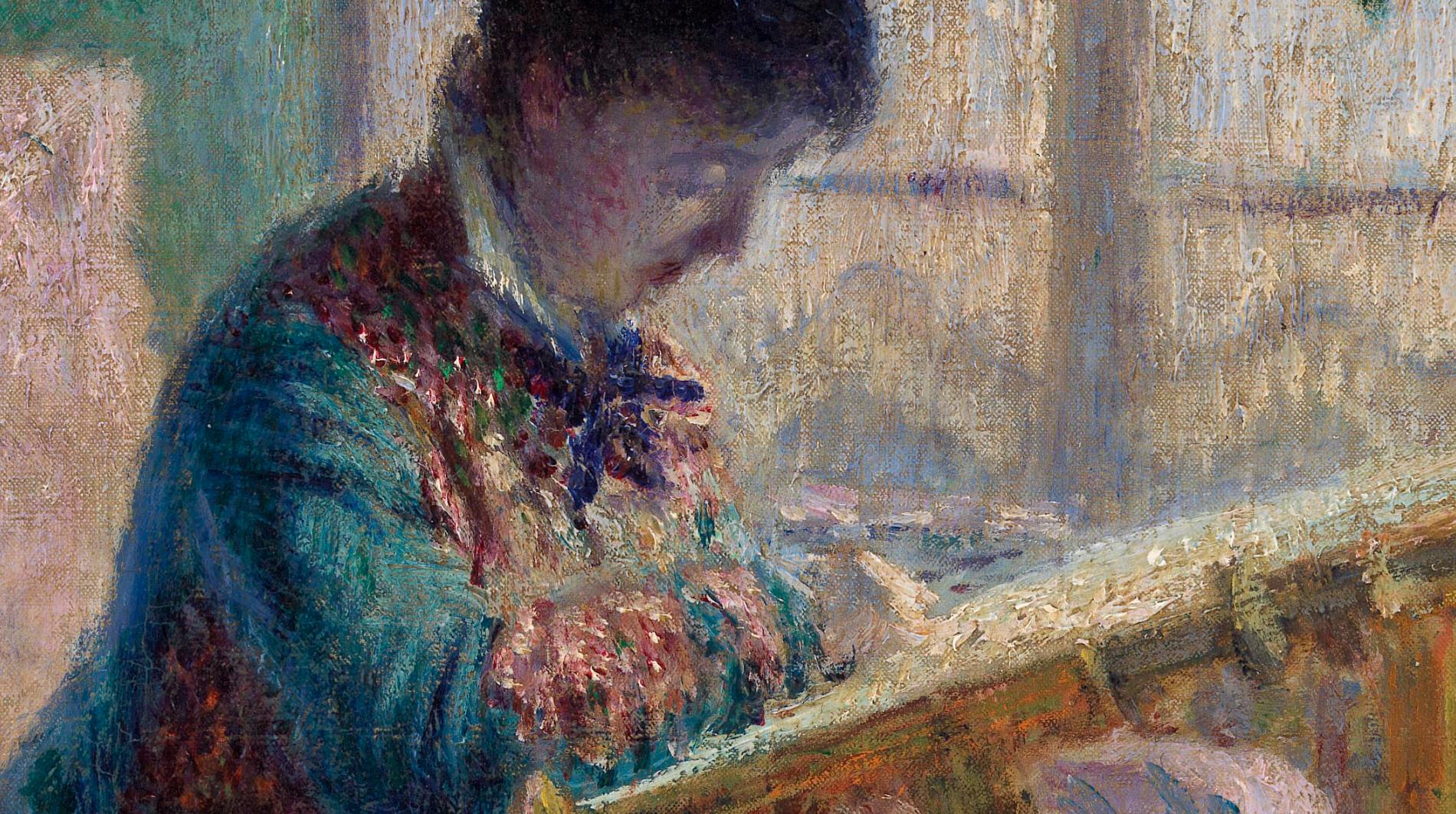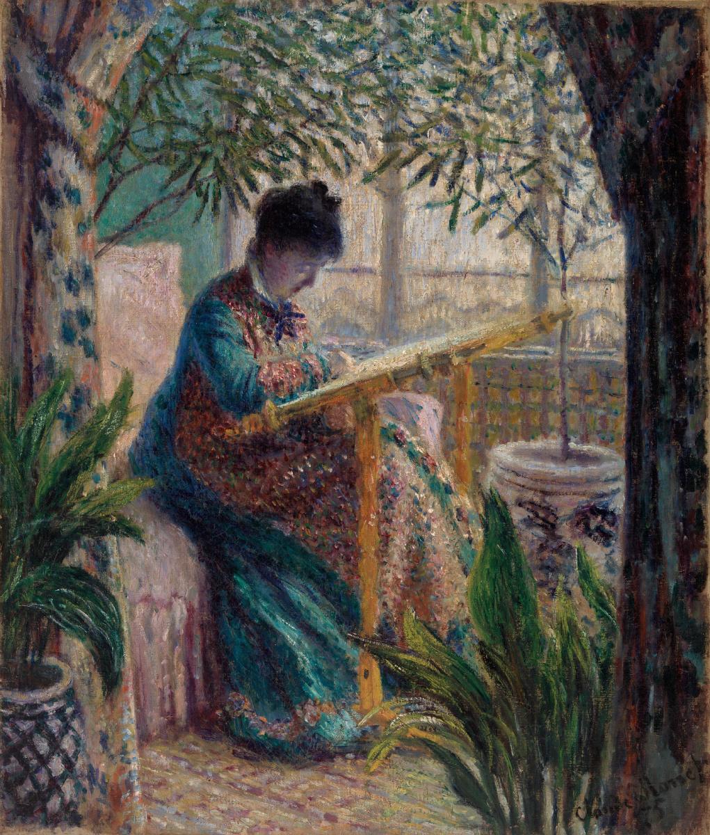 Though Monet preferred painting in the open air, for this work he brought his easel indoors to capture his first wife, Camille Doncieux, sitting at her embroidery loom. Quietly absorbed in her task, Monet‘s figure recalls the scenes of 17th-century Dutch masters, who were enjoying a revival in France at the time. Even indoors, light remains a primary concern for the artist; the touches of white flicker across the front of Camille‘s dress, creating a tapestry-like texture that perhaps alludes to her work on the loom. (Barnes)