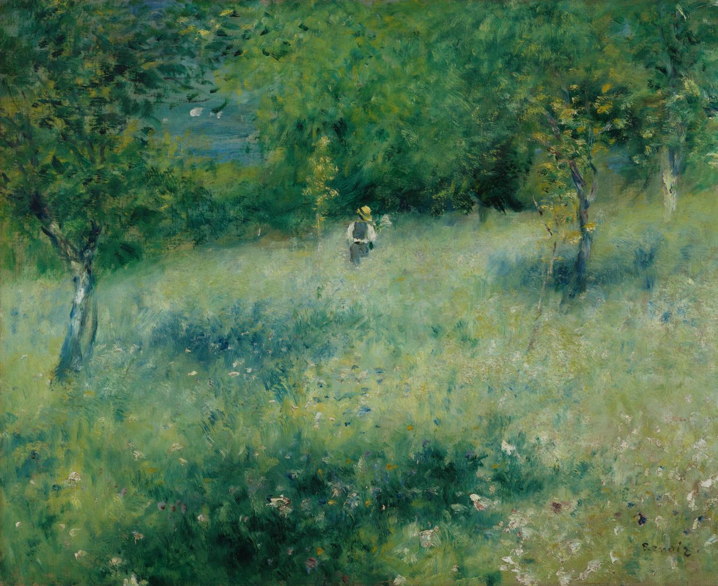The patch of water glimpsed through the trees on the left is the only feature linking this idyllic scene with Chatou. The small riverside town west of Paris was popular with day-trippers and artists. Pierre-Auguste Renoir’s subtle handling of the sunlit meadow is characteristic of how Impressionist painters used colour to convey atmosphere and feeling. Areas of yellow indicate patches of sunlight, alongside the deep green shadows cast by the young trees. The brushwork, loose to the point of abstraction, gives a sense of the tall grasses swaying in the breeze. (Courtauld)