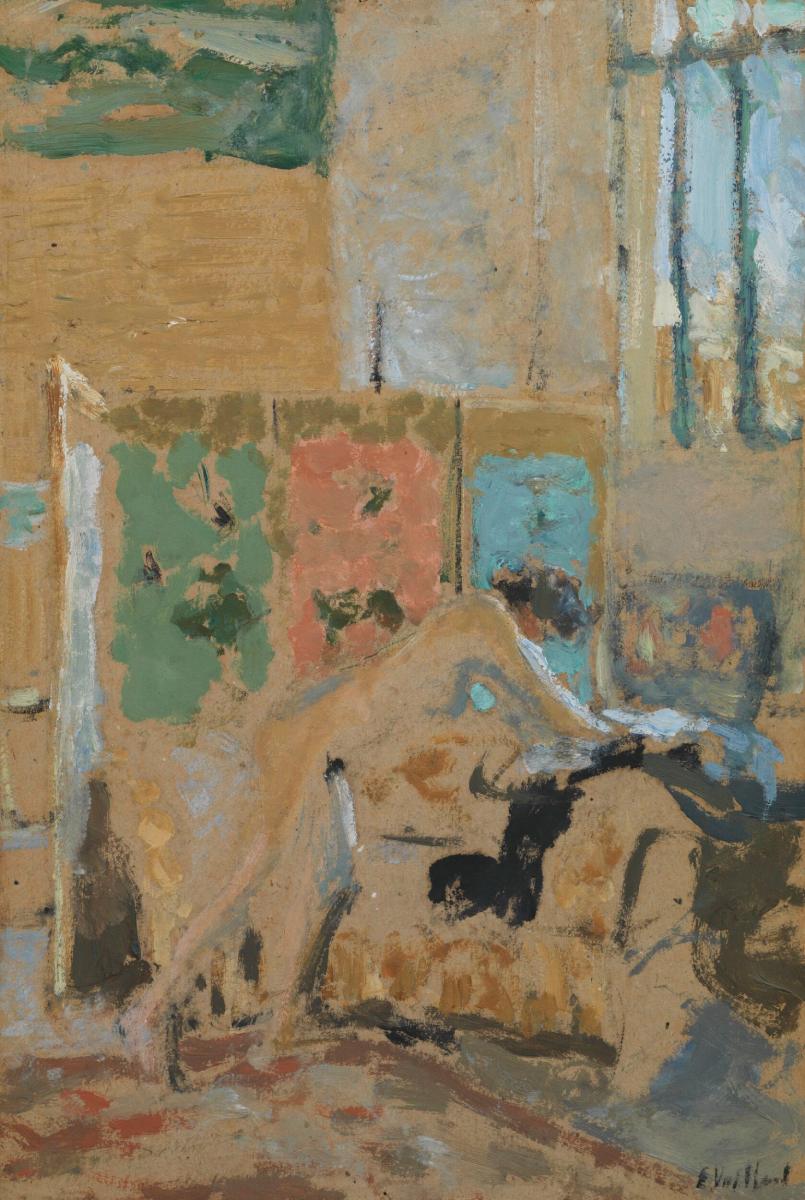 Like many of Édouard Vuillard’s paintings, this intimate work is painted on paper, which is left bare in certain areas. It captures a model in a seemingly unposed moment in the artist’s Paris studio. Earlier interiors by Vuillard are often illuminated by lamplight but, here, he enjoys depicting the effects of natural light falling across the model’s bare arm and thigh. Folding screens were a favoured motif for Vuillard, and he produced three himself, although this one, painted in bright blocks of colour, is not readily identifiable as one of them. (Courtauld)
