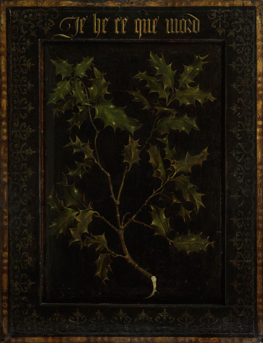 The man looks up, as if he has been interrupted from reading. The cameo in his ring, displayed in close proximity to his book, suggests an interest in antiquity and classical literature. The sitter has been identified as the important Burgundian cleric Guillaume Fillastre. The painting is inscribed ‘Je he ce que mord’ (I hate things that bite), referring to the holly painted on the reverse. However, neither plant nor motto can be associated with Fillastre. (Courtauld)