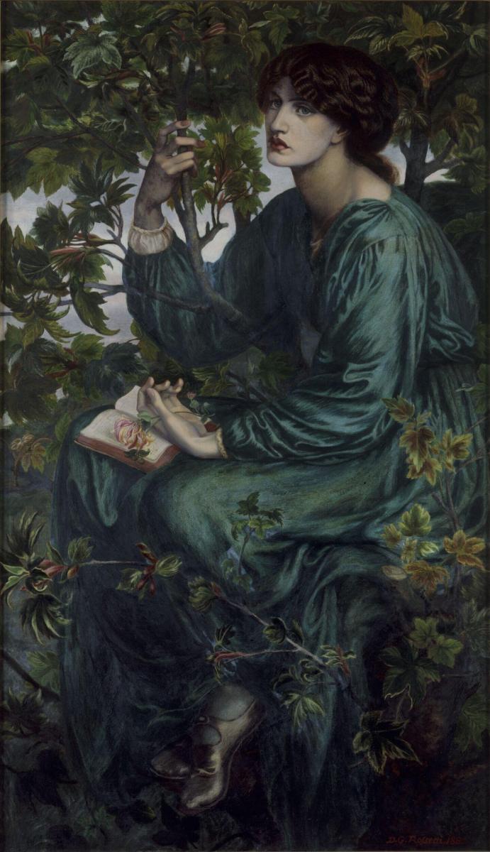 The sitter for this painting was Jane Morris, the wife of William Morris, who often posed for Rossetti. At the time this was painted Rossetti was involved in an illicit love affair with Jane. He shows her sitting in the branches of a sycamore tree and holding a sprig of honeysuckle. This sweet-smelling climbing plant symbolised the bonds of love for the Victorians, and Rossetti may have included it here as a subtle reference to the relationship between artist and model. Rossetti was also a poet, and the title relates to his poem of the same name which ends: