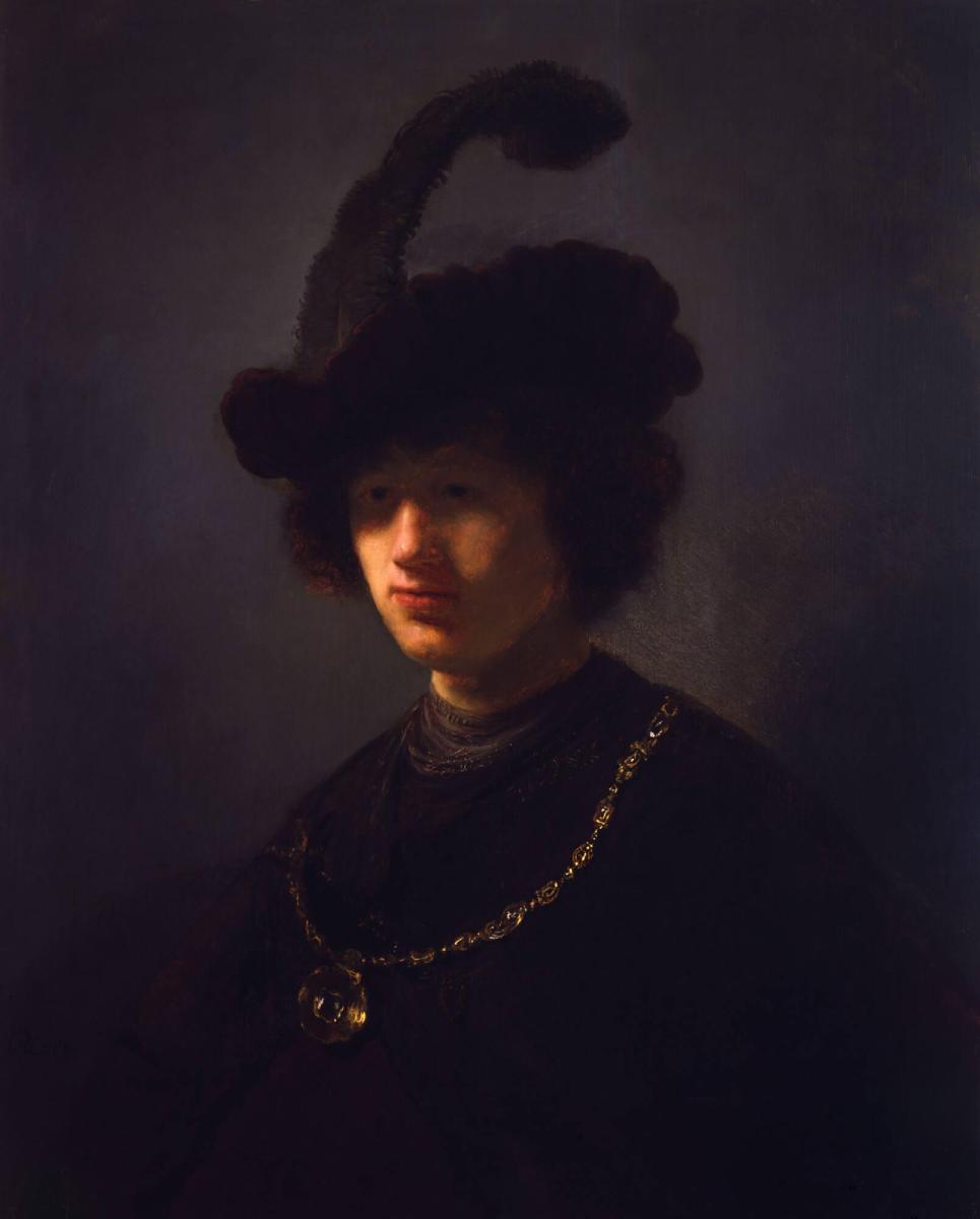 This young man’s flamboyant feathered cap and gold chain did not reflect contemporary 17th-century Dutch fashion. Rather, the theatricality of his costume suggests that instead of being a portrait of a particular person, this painting portrays an anonymous model. Rembrandt painted many exotically clothed character studies, which he used to examine emotions and states of mind and to display his skill at depicting textures and light effects (see also Man in a Fur-lined Coat). These appealing images sold well to Amsterdam’s merchant class, contributing to the young artist’s success in that city after moving from his native Leiden in 1631, the year he painted Young Man with a Plumed Hat. Here, the shadow falling across the youth’s downcast eyes suggests introspection, adding psychological depth to the painting. During his long career, Rembrandt’s great range, wealth of imagination, and depth of feeling allowed him to express the emotions and complexities of the human condition in a way few artists have equaled. (TMA)