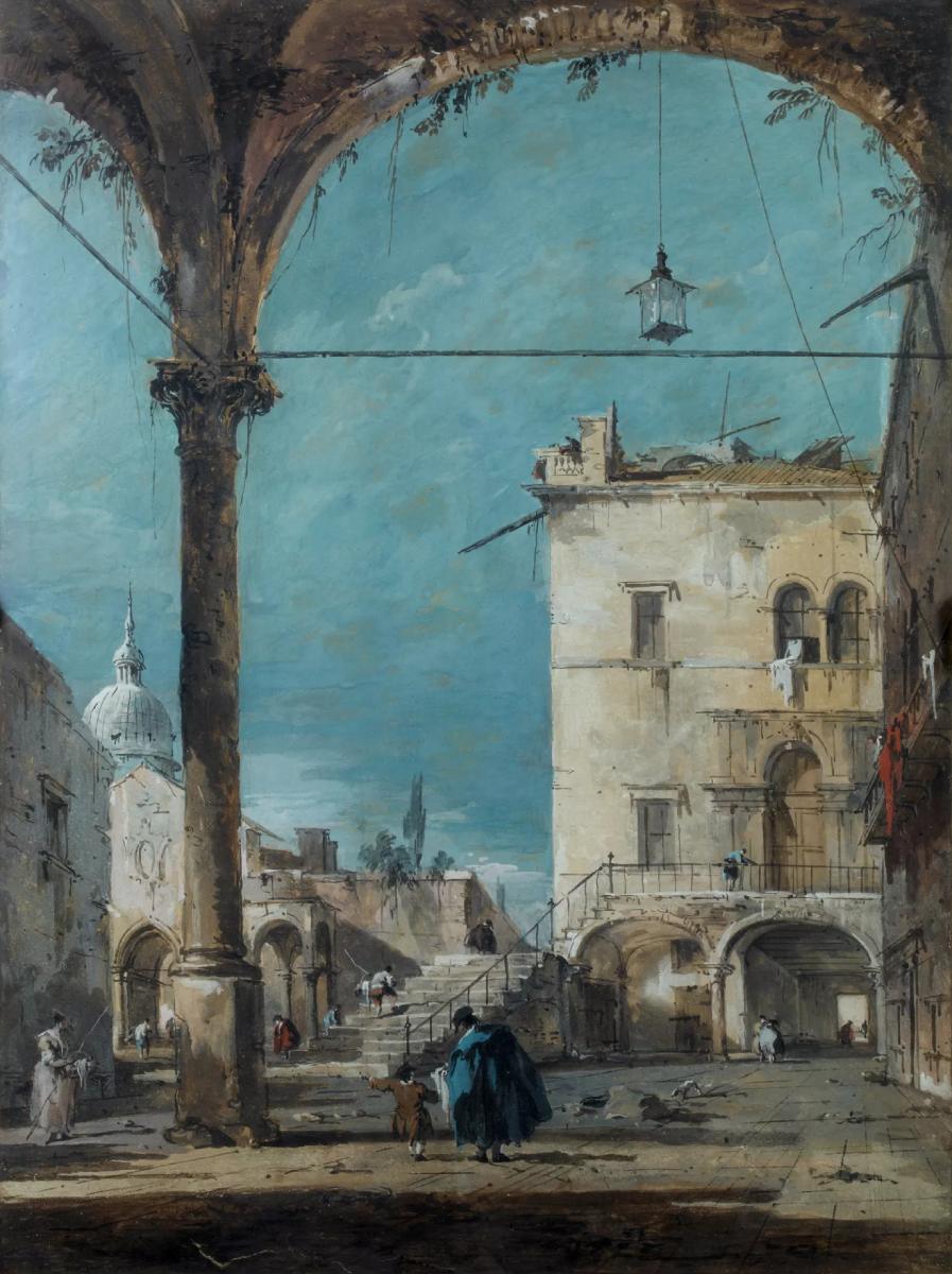 The picture combines realism and fantasy, using a technique that was quite unusual for Guardi: gouache on paper, which gives the strokes a very particular lightness and transparency. The small square he painted, the ‘campo’ animated by figures, is not a specific place in Venice. One might search in vain for this portico with the hanging lantern, the church and its cupola, and the palace with the large stairway. In fact, unlike his master Canaletto, the artist was not trying to reproduce identifiable views of Venice, but rather to represent a familiar perception of the city. With its ever changing light and the meeting point between the sky and the lagoon represented in the same diaphanous and silvery light, the artist was adopting a more sensitive and romantic approach.