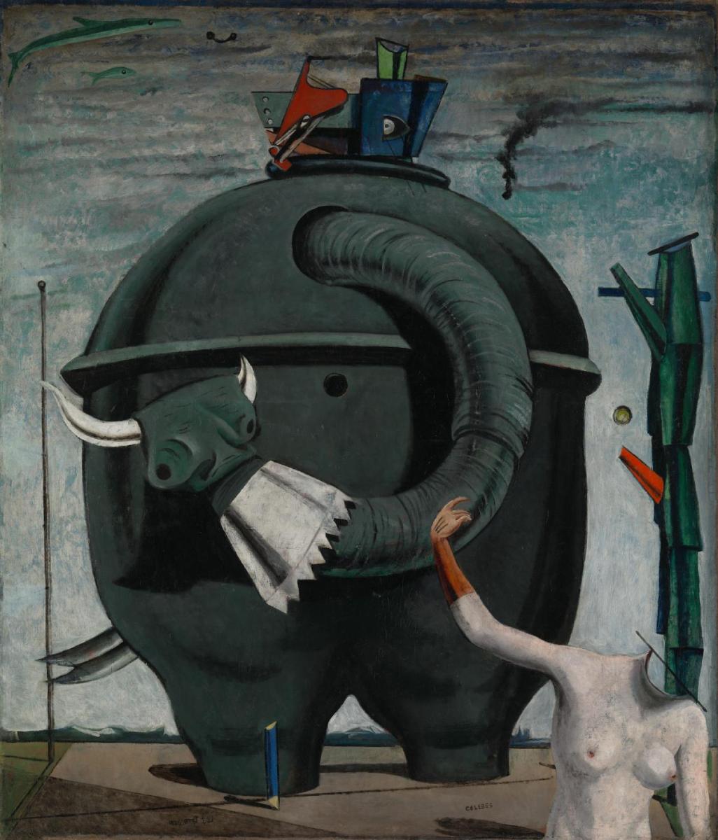 The central rotund shape in this painting derives from a photograph of a Sudanese corn-bin, which Ernst has transformed into a sinister mechanical monster. Ernst often re-used found images, and either added or removed elements in order to create new realities, all the more disturbing for being drawn from the known world. The work’s title comes from a childish German rhyme that begins: ‘The elephant from Celebes has sticky, yellow bottom grease’. The painting’s inexplicable combinations, such as the headless female figure and the elephant-like creature, suggest images from a dream and the Freudian technique of free association. (Tate)