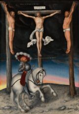 Cranach, Lucas the Elder (1472-1553) The Crucifixion with the Converted Centurion 1536 Oil on panel, 50.8 x 34.6 cm National Gallery of Art, Washington An armored man on horseback looks up at the middle of three men hanging on rough-hewn wooden crosses…
