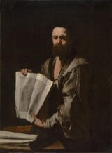 Ribera, Jusepe de (1591-1652) Euclide (Euclid) c.1630–1635 Oil on canvas, 125.1 × 92.4 cm Getty Center, Los Angeles Emerging from deep shadows behind a table, a solemn individual stands displaying a well-worn book with various geometric figures, pseudo-Greek characters, and an…