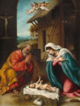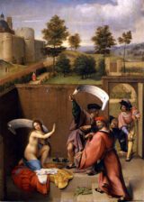 Lotto, Lorenzo (1480-1557) Natività (The Nativity) 1523 Oil on panel, 46 x 35.9 cm National Gallery of Art, Washington A young woman and an older man kneel to either side of a nude baby outside of a barn-like structure in this vertical…