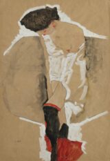 Schiele, Egon (1890-1918) Standing Female in Shirt with Black Stockings and Red Scarf (Stehendes Mädchen im Hemd, mit schwarzen Strümpfen und rotem Tuch) 1911 Gouache, watercolor and pencil on paper, 55.3 x 38.1 cm Private collection Schiele’s early watercolors and drawings…