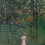 Rousseau, Henri (1844-1910) Paysage exotique (The Equatorial Jungle) 1909 Oil on canvas, 140.6 x 129.5 cm National Gallery of Art, Washington Two animals with golden yellow, brown, and black fur peer out from behind dense jungle foliage in this stylized, vertical painting.…